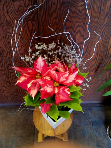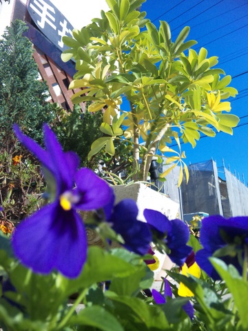 花壇にはスミレが咲いて、お店にはポインセチア。